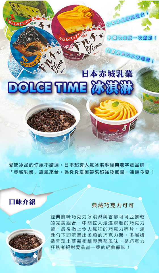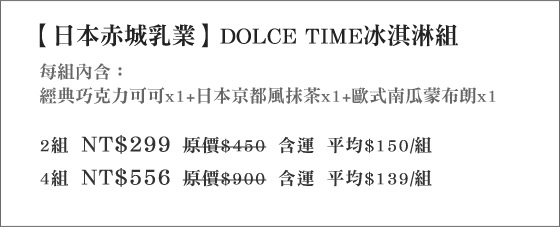 | 日本赤城乳業-DOLCE TIME冰淇淋組-四季都想吃冰,不吃對不起自己!日本冰品老字號「赤城乳業」,超夯人氣!創意、平價又好吃!千萬別錯過!平均每組最低只要139元起(含運)即可購得【日本赤城乳業】 售價:139 我要購買 |